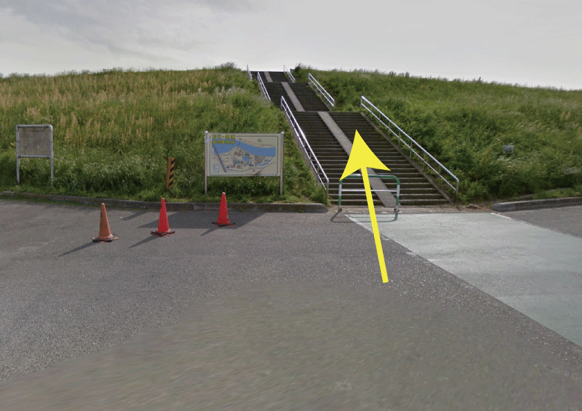 階段を下りると道満グリーンパーク駐車場ゲートがあります。園内の歩道を道なりにまっすぐ進みください。