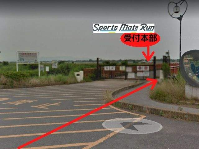 橋を渡りきるとすぐ左手の広場が受付本部です。スポーツメイトランの旗が目印です。